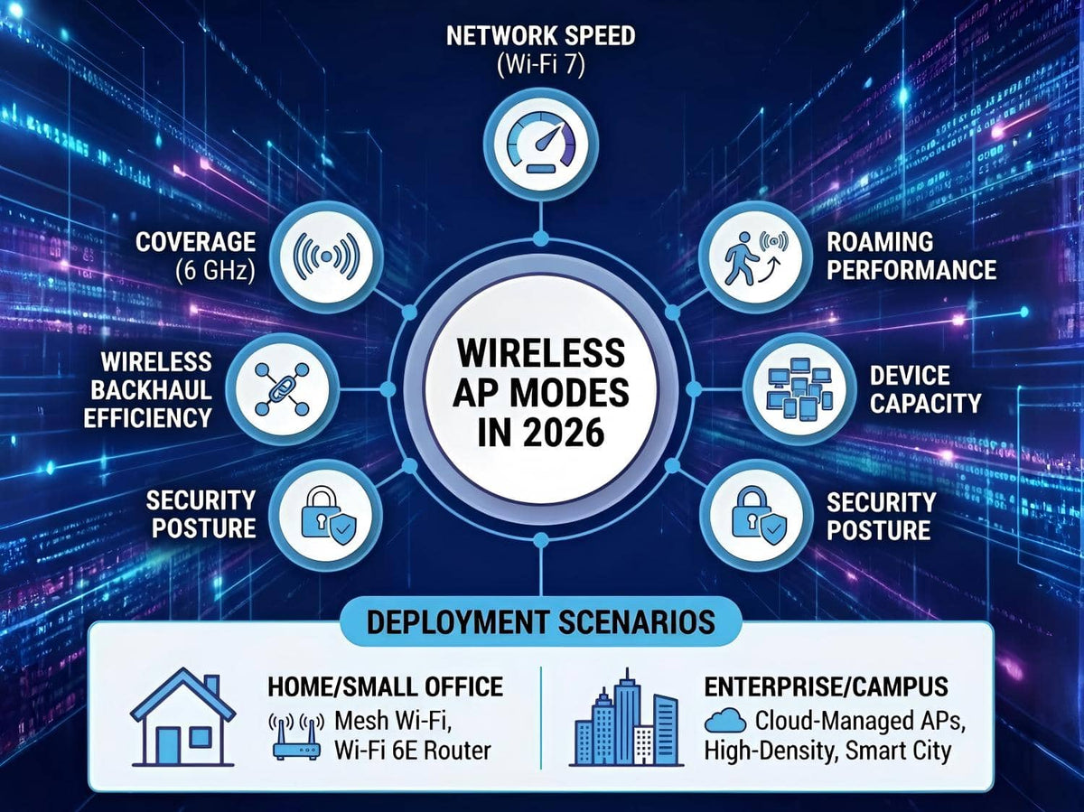 In 2026, wireless networking is no longer a simple “install one router and get Wi-Fi” scenario. With the rise of Wi-Fi 6E, Wi-Fi 7, 6 GHz spectrum, Mesh Wi-Fi, cloud-managed APs, and large-scale enterprise deployments, choosing the correct wireless access point (AP) mode is essential for achieving stable, fast, and secure wireless connectivity.