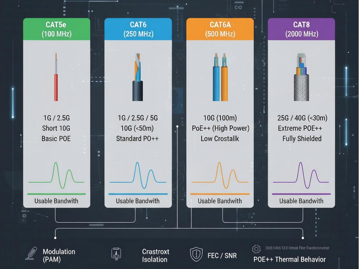 Cat5e supports up to 100 MHz and is suitable for 1G and sometimes 2.5G. Cat6 supports 250 MHz and can run 10G only at short distances. Cat6A supports 500 MHz and reliably delivers 10G up to 100 m. Cat8 supports 2000 MHz for 25G/40G at 30 m.
